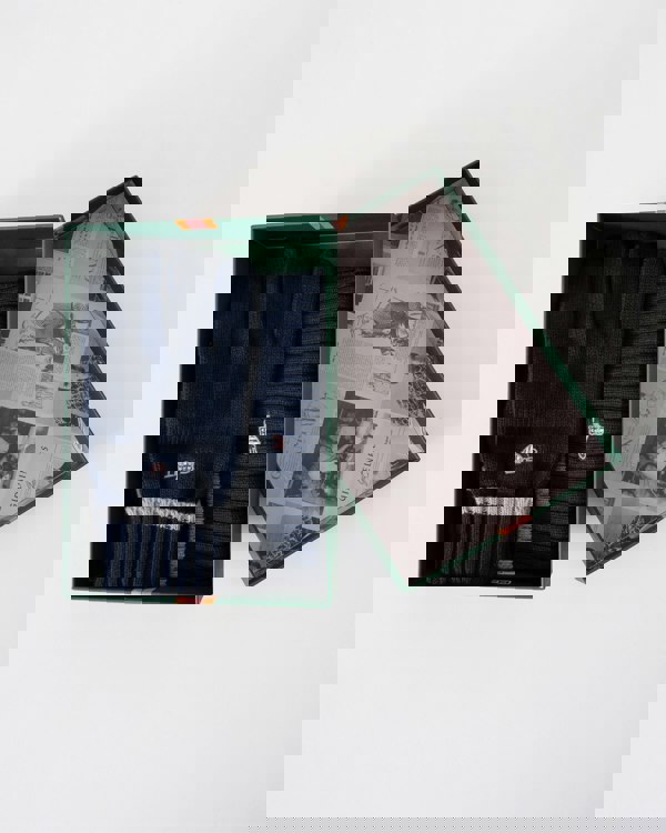GANT Essential Beanie & Gloves Set in 410 Marine The Essential Gift Set includes a matching beanie and gloves, both crafted from a soft cotton blend for warmth and comfort. The beanie features a ribbed knit design, while the gloves are made in a smooth plain knit. Both pieces are finished with contrast tipping and an embroidered Gant shield, adding a refined touch to this winter-ready duo.