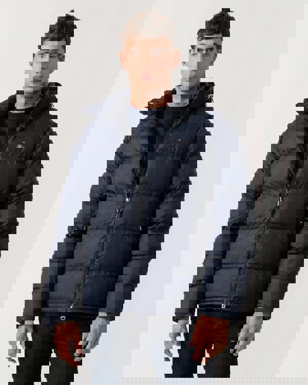Ideal for days spent outdoors, the Active Cloud Jacket is crafted to hip length and tailored for a regular fit, ensuring comfort and functionality. Treated with a water-repellent finish, it provides protection from the elements. The jacket boasts a puffer design with a fully lined padded interior, a detachable hood, and convenient slanted side zip pockets for storage. It is accented with a sleek front zip closure, storm cuffs, and adorned with a GANT shield graphic at the chest, adding a touch of style to its practicality. This product is made with recycled polyester, aligned with GANT's sustainability strategy to support circularity.