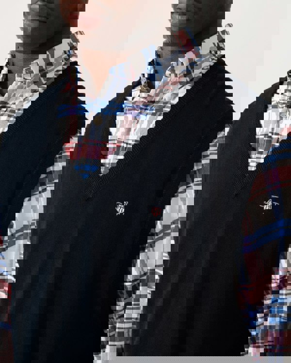 Made from cotton and tailored to a regular fit, this sleeveless vest is both versatile and timeless. It boasts ribbed hem endings, a classic V-neck, and an embroidered GANT shield graphic on the chest.