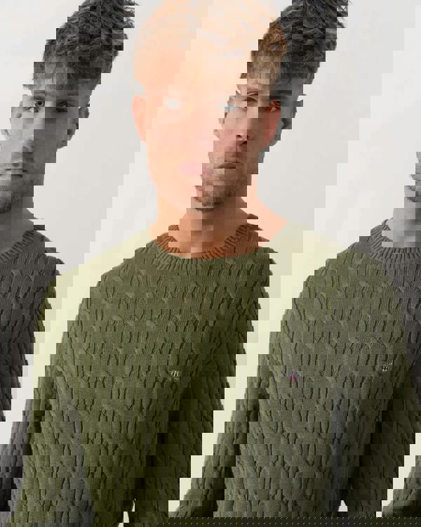 Model wearing GANT Mens Cotton Cable Knit Crew Neck Jumper in 379 Dry Herb Green - Main