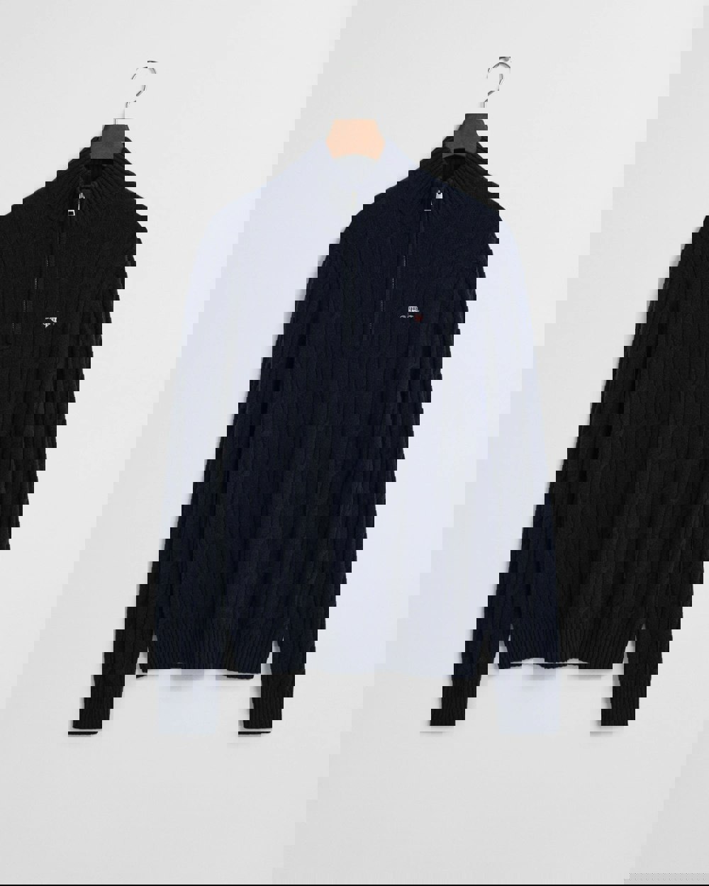 This preppy cable knit sweater, crafted from soft and lustrous lambswool yarn, is ideal for the colder season. Designed for a regular fit, it features a half-zip collar, ribbed detailing at the hem and cuffs, and proudly displays the iconic GANT shield embroidered on the chest.