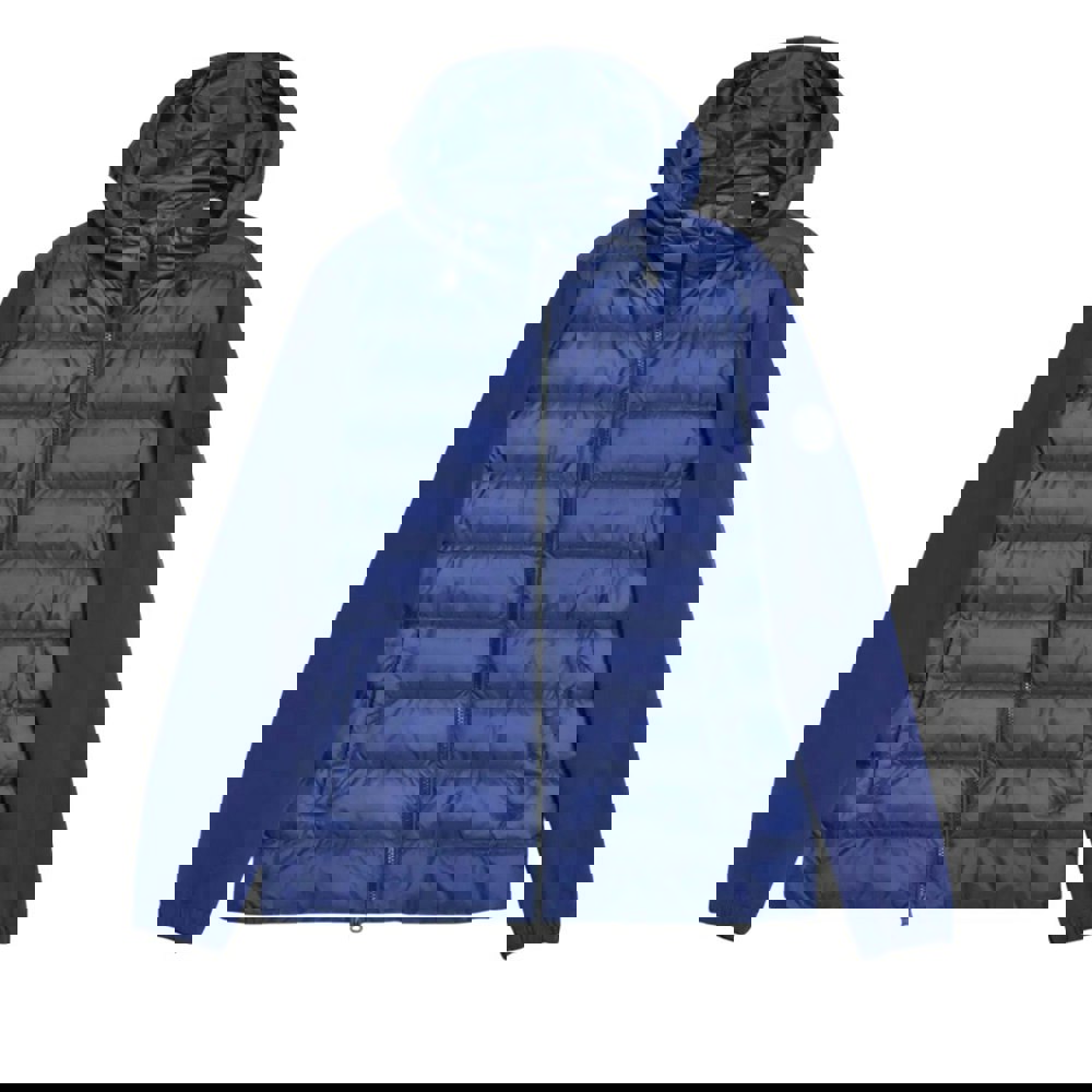 This mixed softshell down jacket comes in navy with a plain, quilted finish and a rubber badge detail. The shell is made from recycled polyester, with a filling of 90% down and 10% feather. It has an insulating, lightweight and water repellent fabric technology, suited to everyday outerwear.