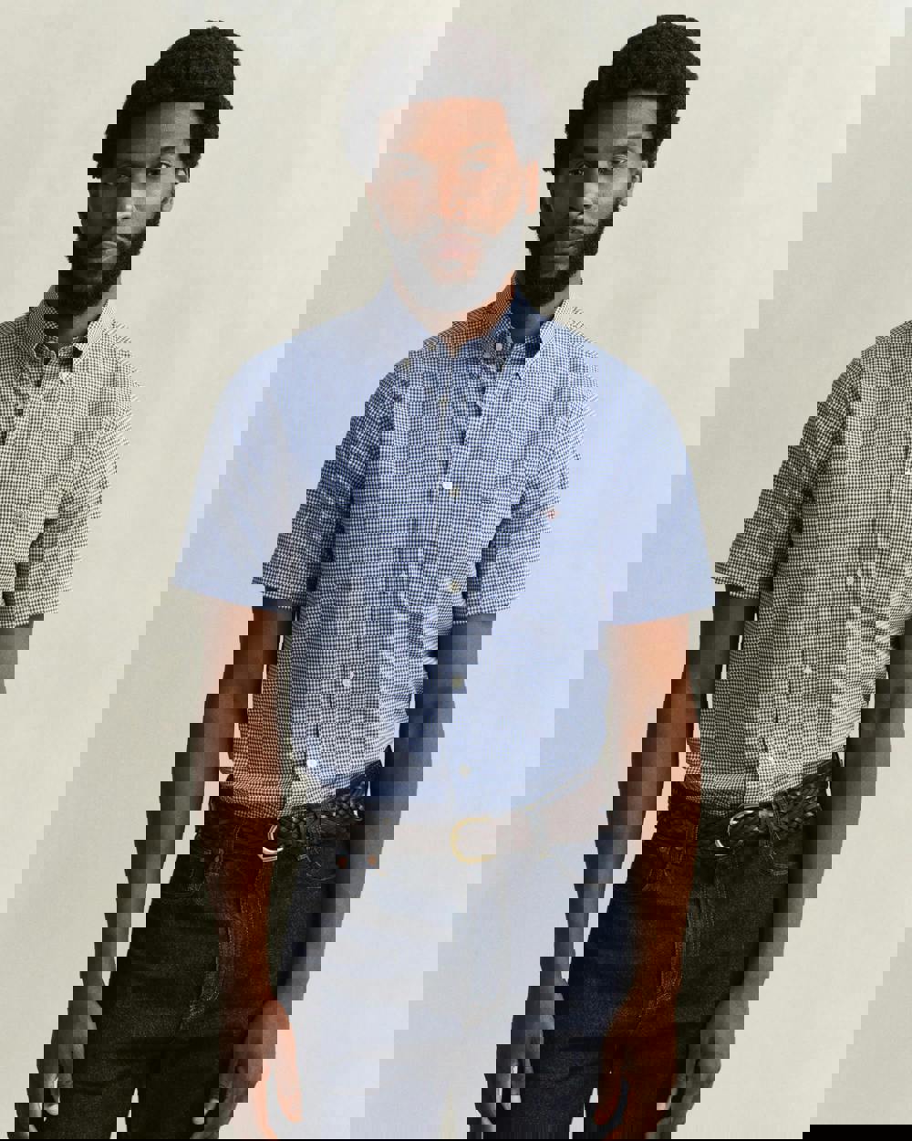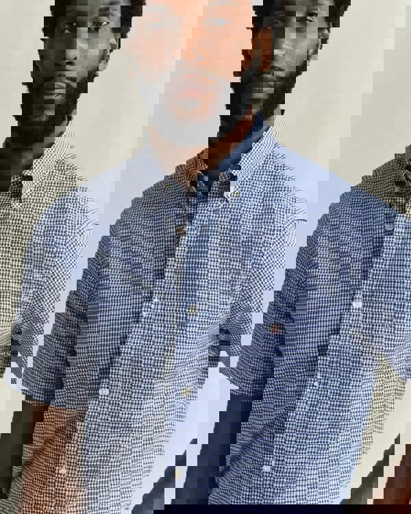 This Gant shirt is made from durable cotton poplin and garment-washed for extra softness. It features a yarn-dyed gingham check, short sleeves, a button-down collar, and a curved hem. Designed for a regular fit, it’s finished with a box pleat and Gant’s signature locker loop at the back, plus an '80s-style shield graphic embroidered on the chest pocket.