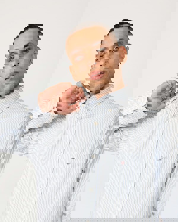 Featuring an 80s archive-inspired shield graphic with retro appeal, this Oxford shirt features a regular fit and a classic banker stripe throughout the garment. Detailed with a button-down collar and a curved hem, this shirt is a preppy essential for any business-casual wardrobe.
