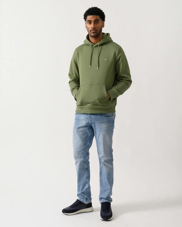 Cut for a regular fit, the GANT Shield Logo pullover hoodie offers an easy layer for everyday wear. The design includes a hood with silver-tone drawstring eyelets and a classic kangaroo pocket, finished with a small embroidered shield graphic at the chest for a subtle branded detail. Shown here in 379 dry herb green, it’s made from a cotton blend with recycled polyester.