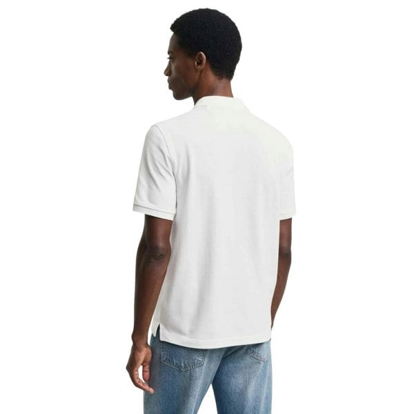 Cut from 100% cotton in a piqué fabric, this men’s polo shirt offers a clean, structured look for everyday wear. It comes in white with an embroidered shield logo and a classic collared neckline, finished with a flat knit collar for a neat outline.