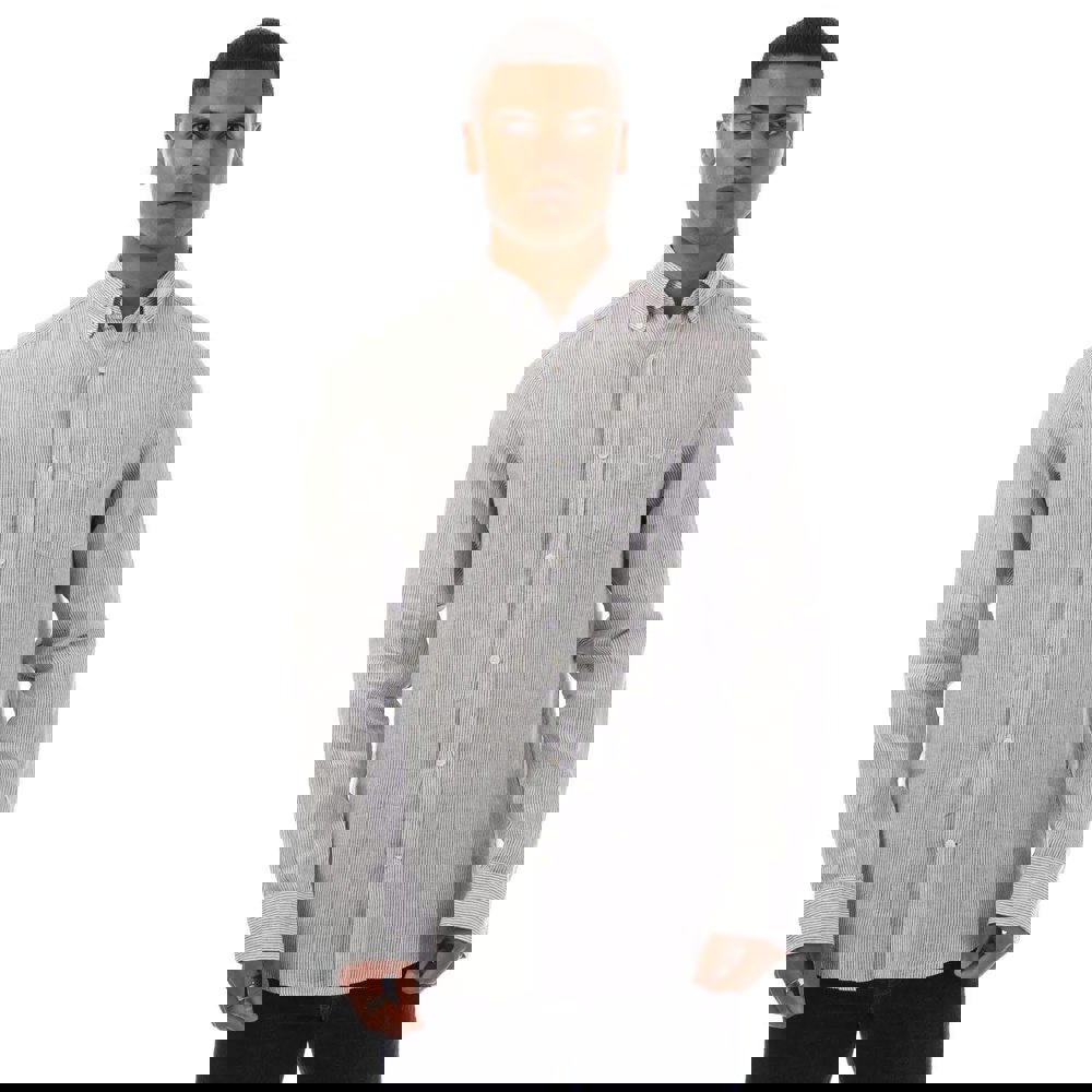 This men’s shirt is made from 100% linen with a yarn-dyed finish and a striped design. It has a collared, button-down neckline and a full button-down fastening, finished with an embroidered logo for a clean, classic look.