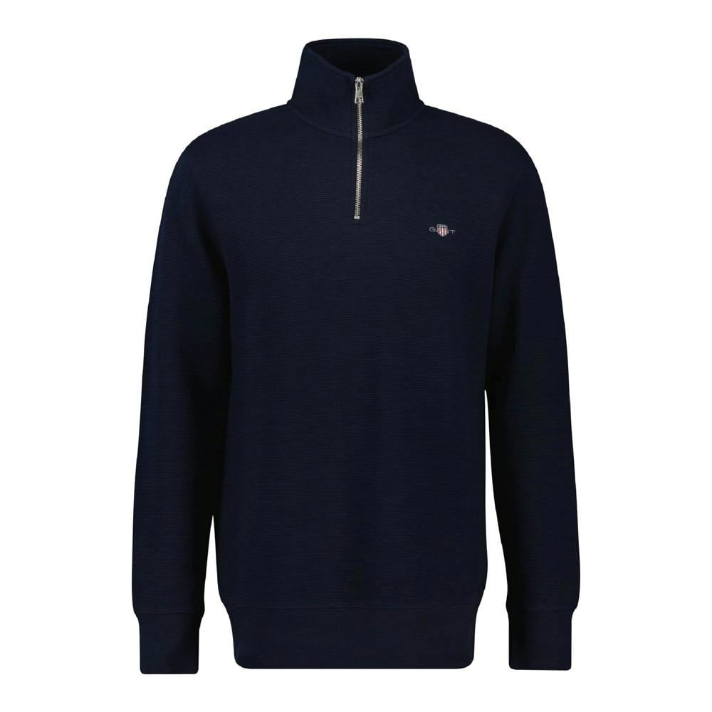 This textured half zip sweatshirt from GANT is made from 87% cotton and 13% polyester. Finished in blue with a plain design, it includes an embroidered logo for a clean, understated look.