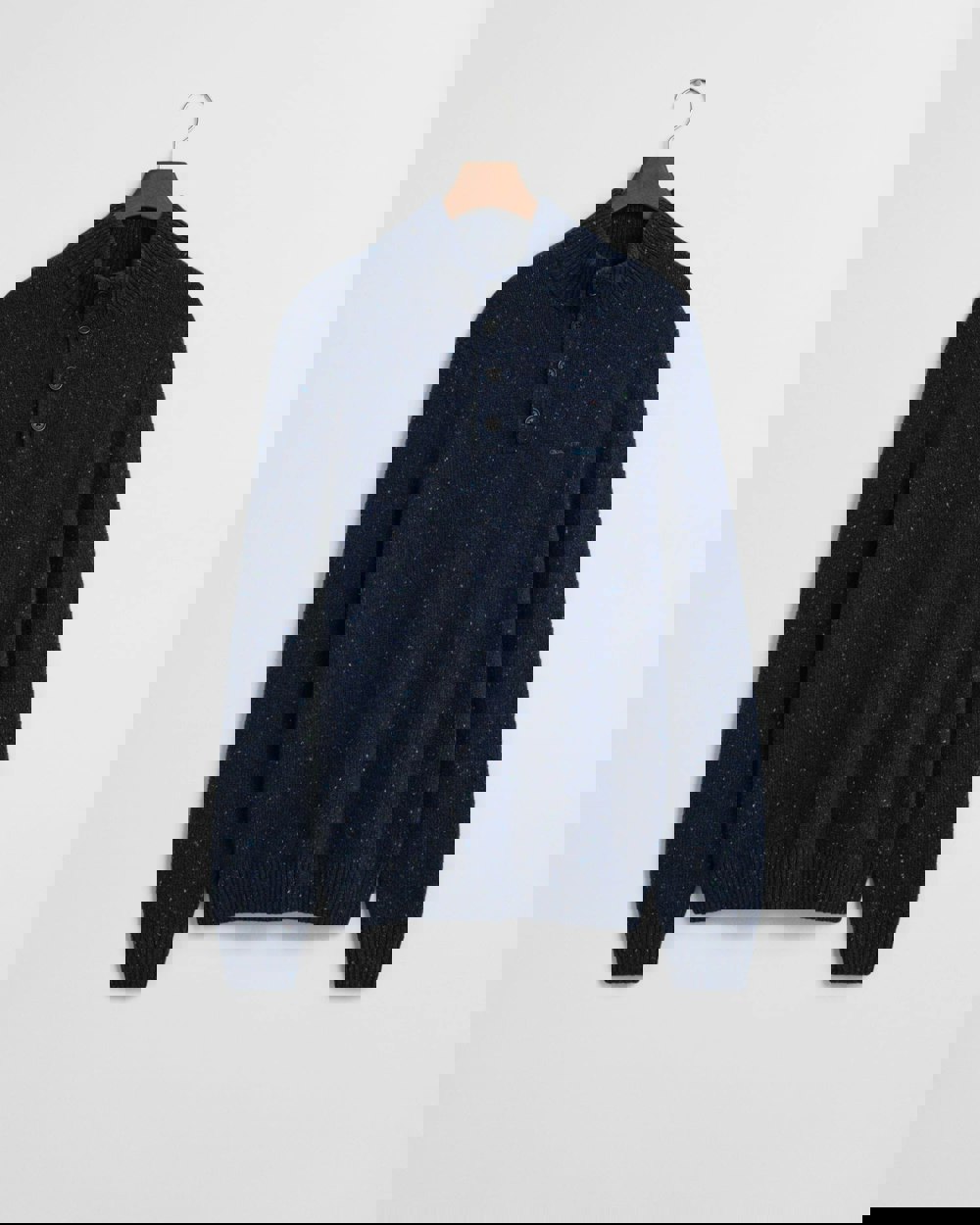 This knitted sweater from GANT, crafted from a soft Italian wool blend with nepps yarn, creates a charming speckled effect. Designed for a regular fit, it features a half-buttoned collar with corozo buttons, ribbed endings at the hem and cuffs, and a subtle GANT logo embroidered at the chest, adding a touch of branding.