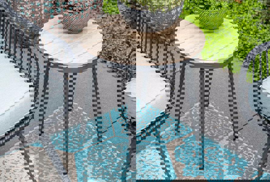 Made with powder coated aluminium they are completely weather and rust proof and will happily live outside all year round. The wood effect table top is made from Vironwood - a composite resin based material that is weatherproof and low maintenance to give that wood effect look without the hassle!