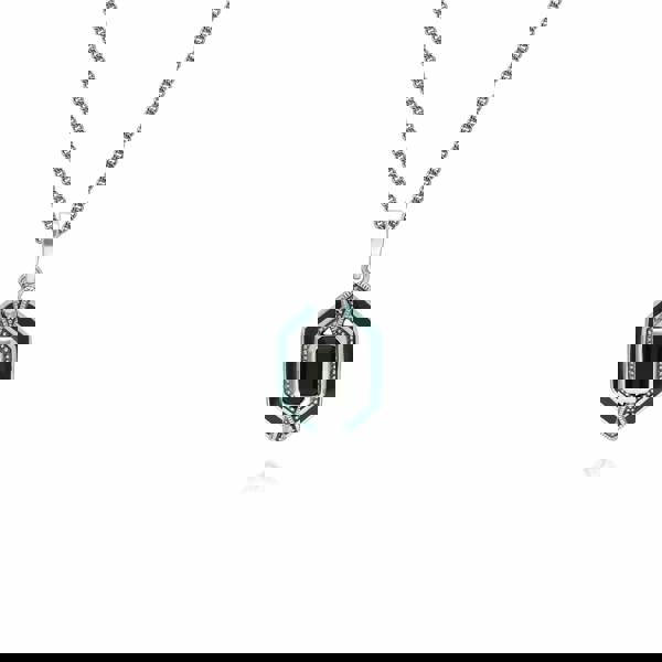 An octagon black onyx ring and necklace set decorated with marcasite gemstones and green enamel. This set comes with a sterling silver 45cm chain.