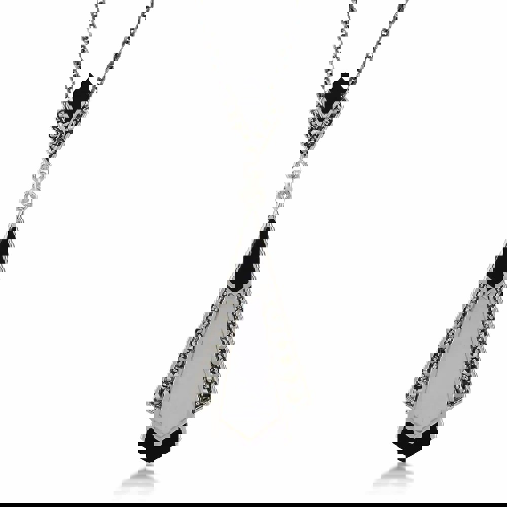 A wonderful art deco style pendant crafted from sterling silver, set with cabochon cut black onyx and white mother of pearl finished with handset sparkling marcasite gemstones