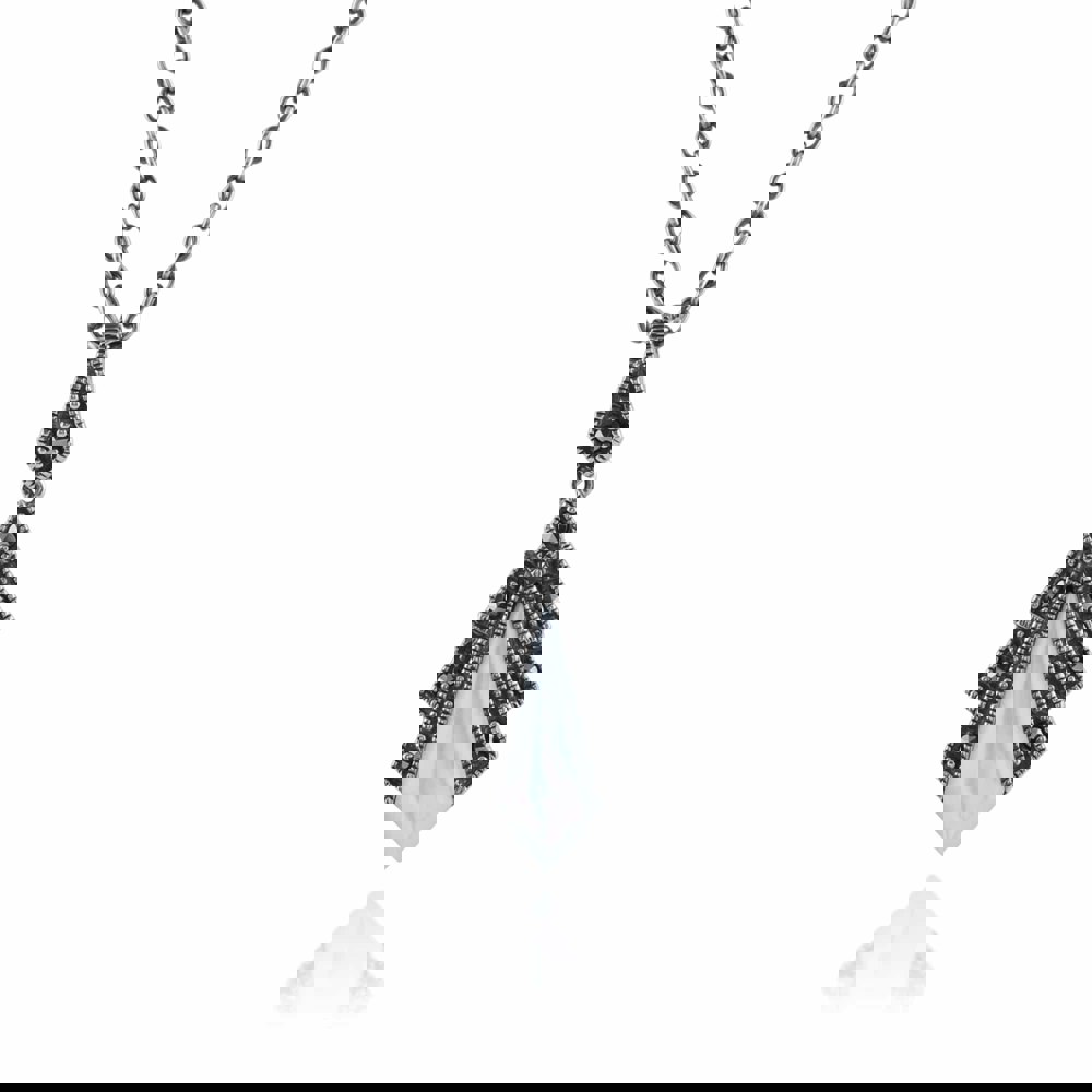 Crafted from sterling silver, this Art Deco inspired necklace features a mother of pearl gemstone decorated with a fan of sparkling marcasite gemstones. This elegant white mother of pearl necklace design channels Art Deco inspirations through its sparkling embellishments and geometric lines.