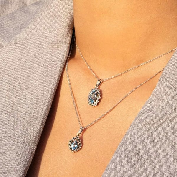 A dazzling Art Deco style pear-shaped blue topaz and marcasite pendant necklace in sterling silver, featuring a brilliant pear-cut blue topaz framed by sparkling marcasite accents. Set in polished sterling silver, this necklace embodies vintage elegance and timeless sophistication, offering a graceful touch of colour and classic charm.