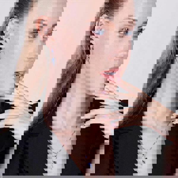 Crafted from sterling silver, this art deco necklace features a triangular lapis lazuli stone decorated with sparkling marcasite gemstones with a pear shaped lapis lazuli gemstone above. This elegant necklace design channels Art Deco inspirations through its sparkling embellishments and geometric shapes.