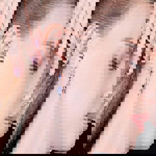 Crafted from sterling silver, these Art Deco inspired drop earrings feature two stunning lapis lazuli cabochon gemstones on each earring and are decorated with a lining of sparkling marcasite gemstones.