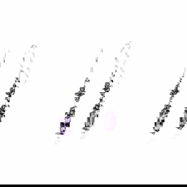 An impressive pair of marcasite drop earrings made from sterling silver, highlighting an oval shaped amethyst gemstone encompossed by marcasite gemstones. These earrings have a post and butterfly clip and are suitable for pierced ears only.