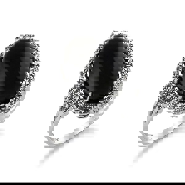 This unique Onyx cabochon Art Nouveau statement ring channels organic and opulent shapes. Onyx has been thought to dispel negative emotion and encourage intelligence and confidence. Once used as a substitute for the shine of a diamond, the natural semi-precious gemstone marcasite is now celebrated for its lustre and metallic beauty. Together in this fine fashion silver gothic ring design, Onyx and marcasite make a stunning couple and an on-trend addition to your jewellery collection.