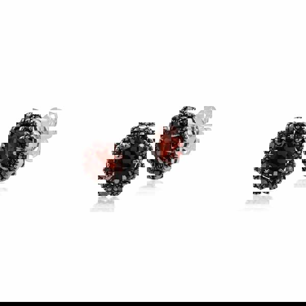 A beautiful pair of art nouveau style floral stud earrings crafted from sterling silver, featuring a central round faceted Mozambique garnet gemstone, surrounded by sparkling marcasites with a matching art nouveau style ring.