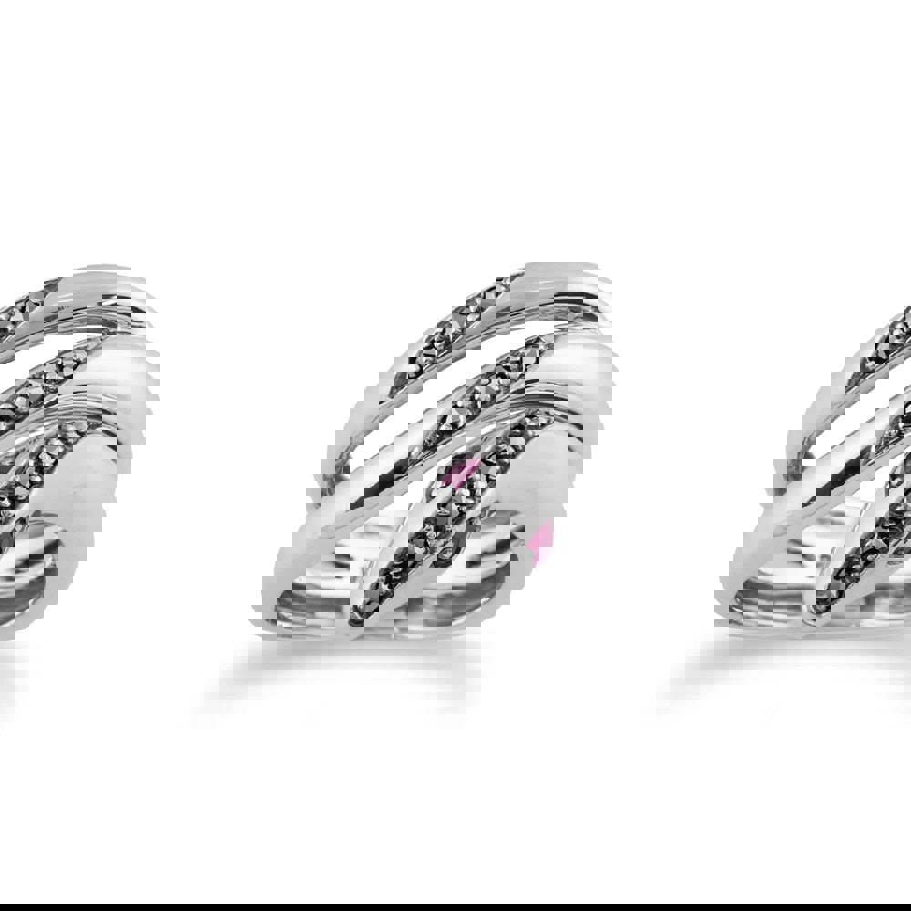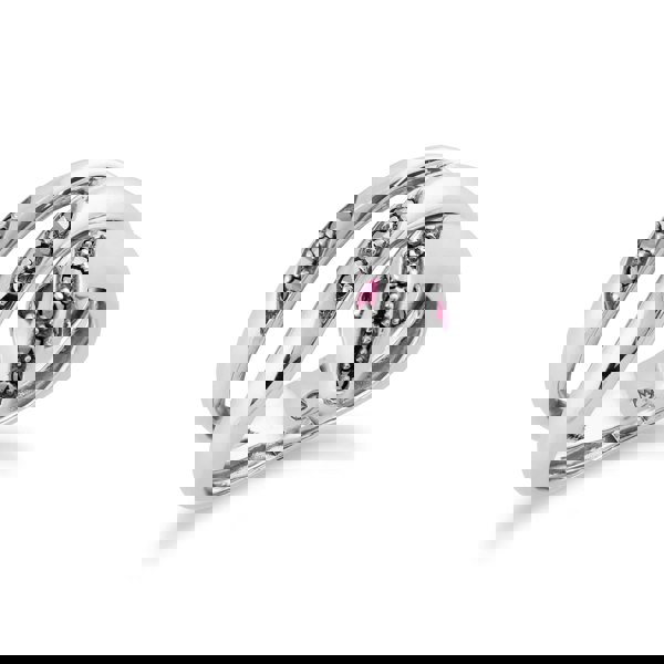 A stunning Art Nouveau style ring crafted from sterling silver set with two faceted ruby gemstones to create the eyes of the snake, offset with sparkling marcasite gemstones.