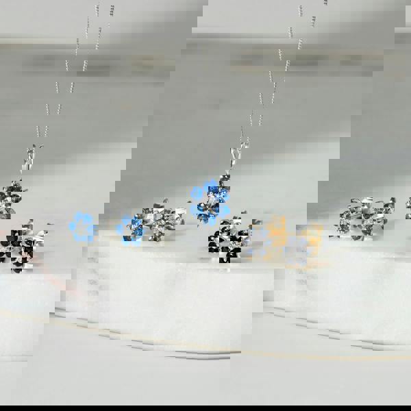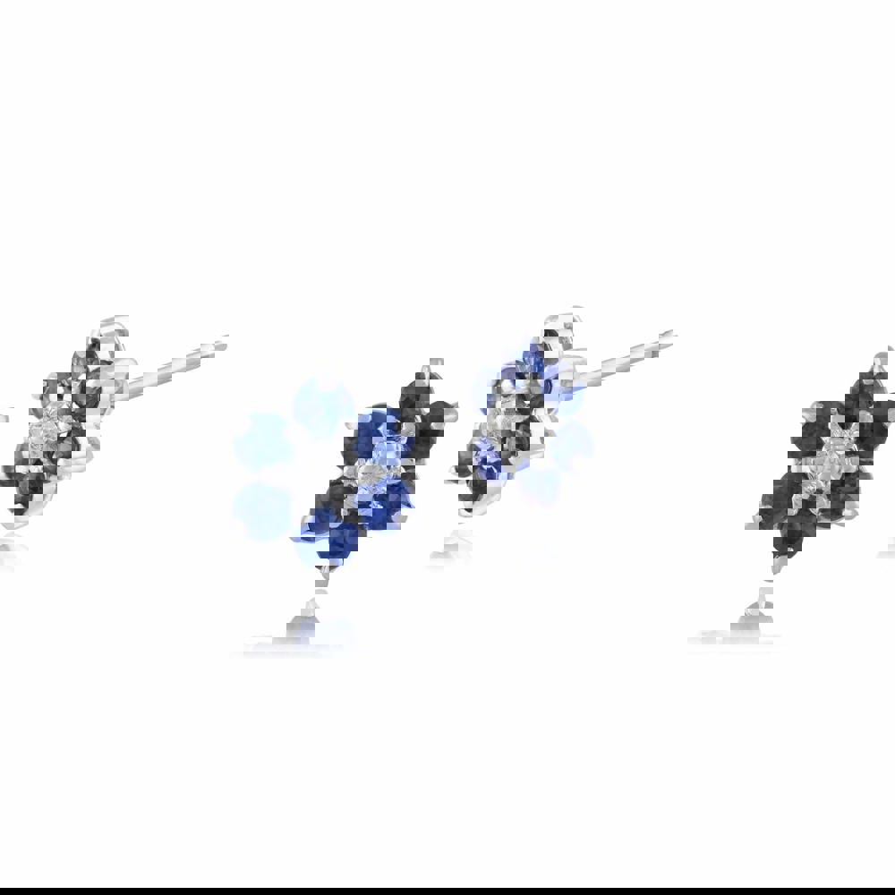 A pair of floral cluster stud earrings crafted from 9ct white gold and set with 6 light blue sapphire gemstones around a central single cut white diamond