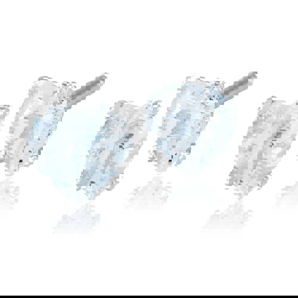 A stunning pair of classic heart single stone stud earrings crafted from 9ct white gold featuring a central heart cut faceted aquamarine gemstone in a four claw setting.