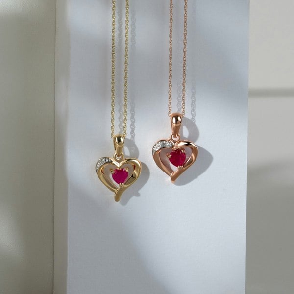 A stunning heart necklace from the Gemondo Classic collection crafted from 9ct yellow gold. Necklace features a cut out heart design accentuated by a heart cut blood red ruby and a dazzling white diamond.