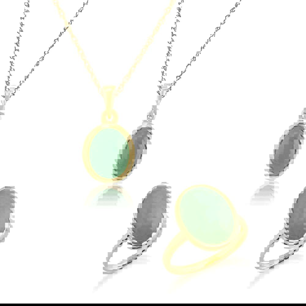 A beautiful oval design necklace and ring set, featuring large oval cut dyed green jade gemstones framed elegantly in 9ct yellow gold.