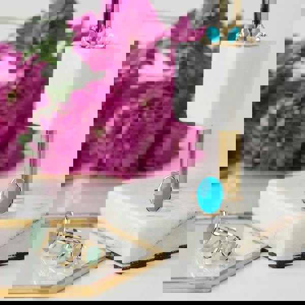 A classic stud earring and ring set, crafted from 9ct yellow gold, featuring oval dyed green jadeite cabochons in bezel settings.