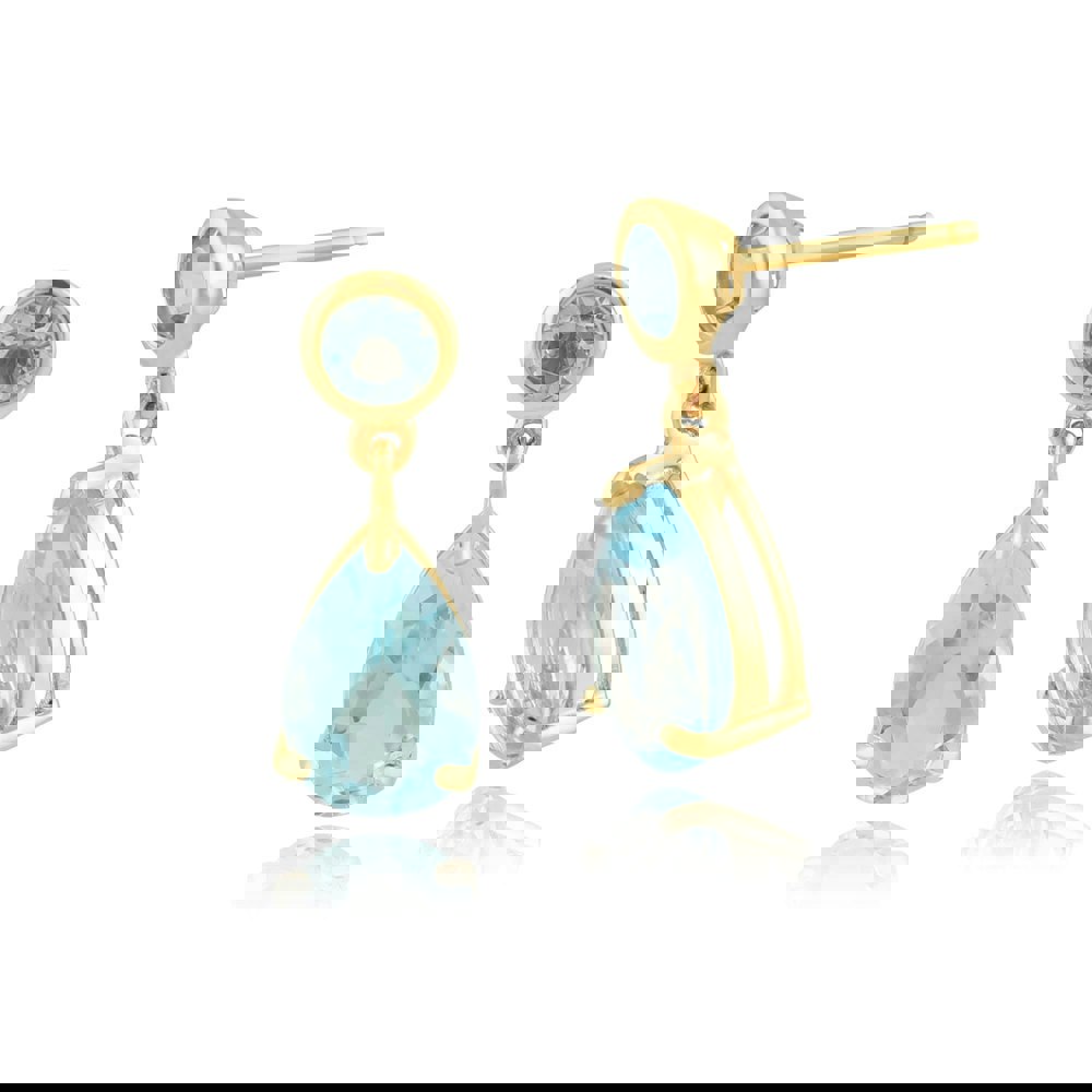 9ct yellow gold drop earrings with a brilliant cut blue topaz gemstones at the top of the earrings dropping into a pear cut deep blue topaz