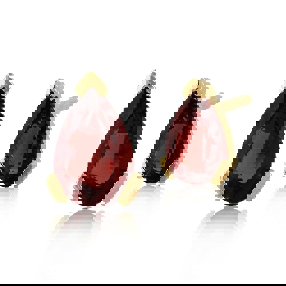 Classic design stud earrings in 9ct yellow gold metal featuring rich 'warm' red colour pear cut garnet stones