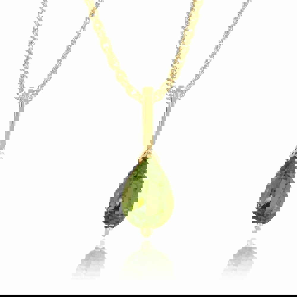 A beautiful single stone design pendant crafted from 9ct yellow gold features a pear cut bright green peridot gemstone framed in a delicate surround of yellow gold