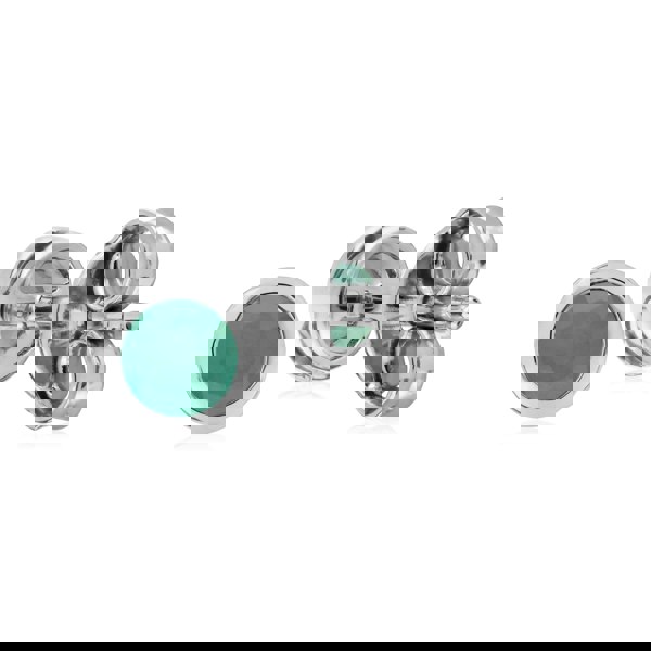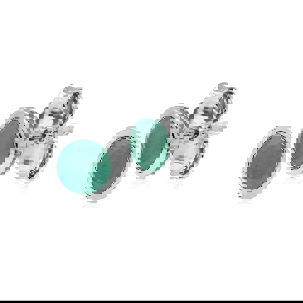 A traditional yet elegant stud earring set in sterling silver, displaying two round bezel set emerald gemstones. These earrings have a post and butterfly clip and are suitable for pierced ears only.