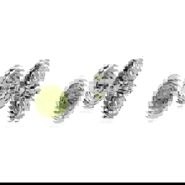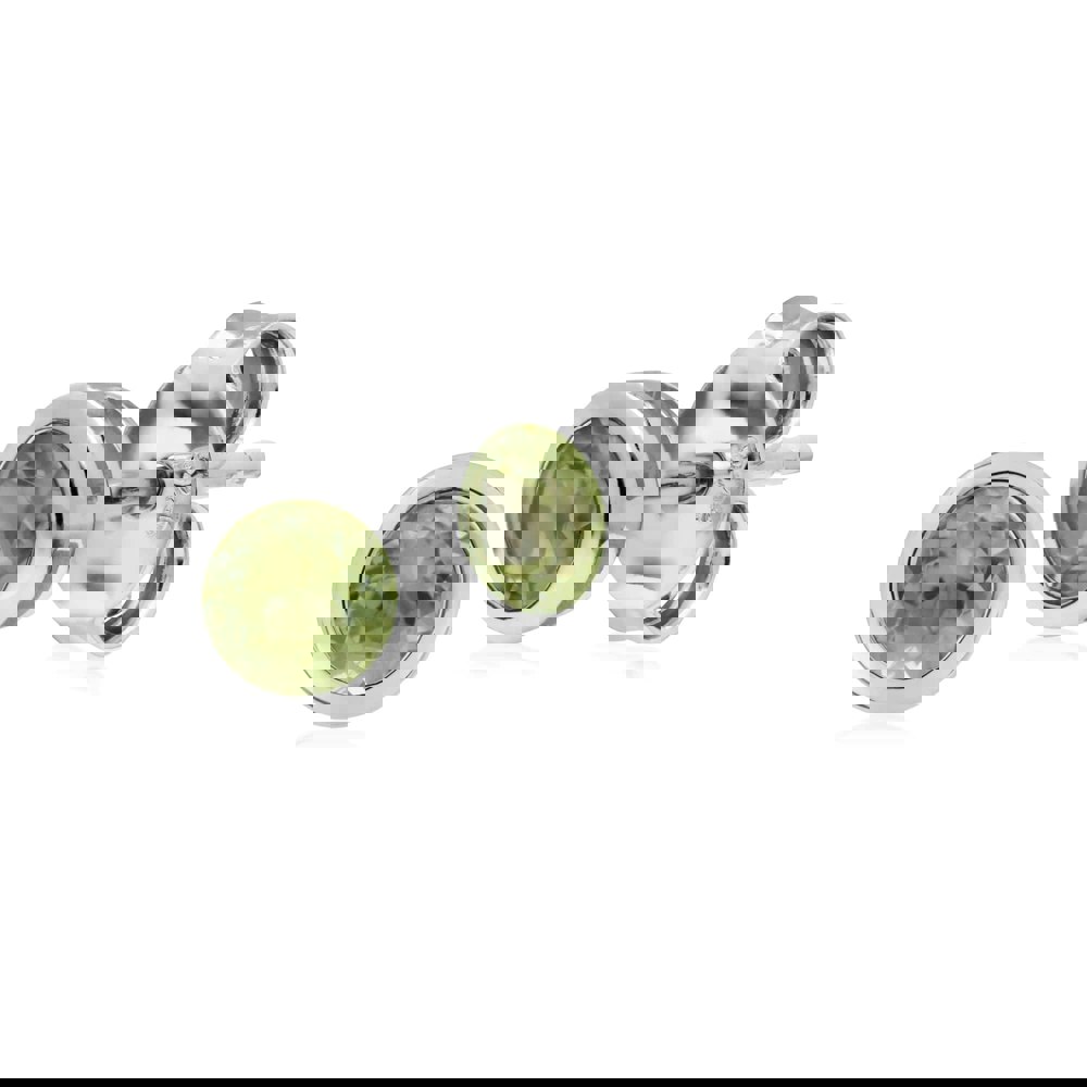 A simple yet dignified stud earring set in sterling silver, each displaying round bezel peridot gemstone. These earrings have a post and butterfly clip and are suitable for pierced ears only.