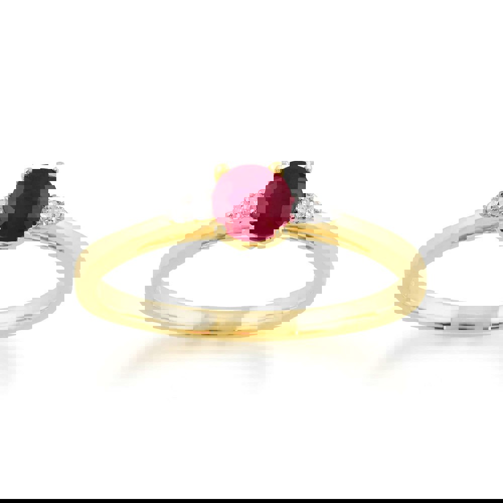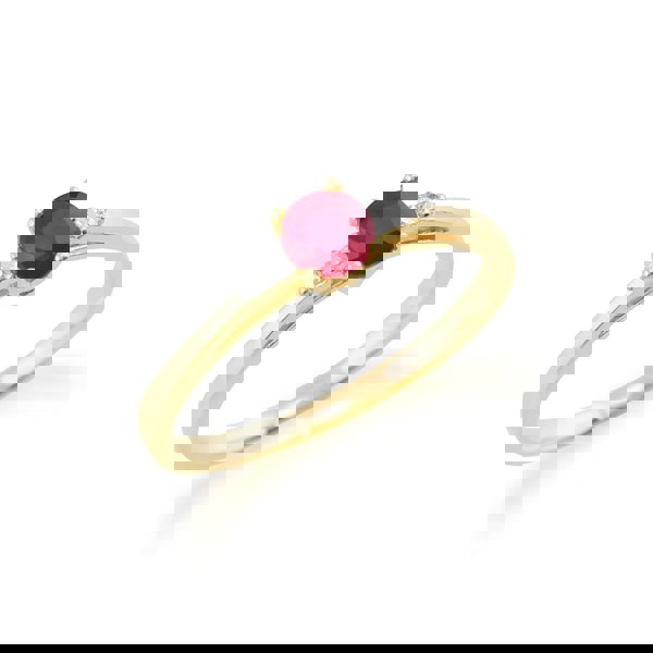Add a pop of colour to your look with this vivid red ruby ring featuring a round cut claw set gemstone with petite diamond shoulders on a classic 9ct yellow gold band.