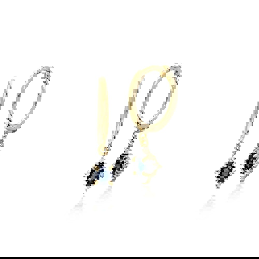 A stunning pair of hoop earrings crafted from 9ct yellow gold, featuring a round sapphire gemstone on each earring, decorated with sparkling single cut diamonds.