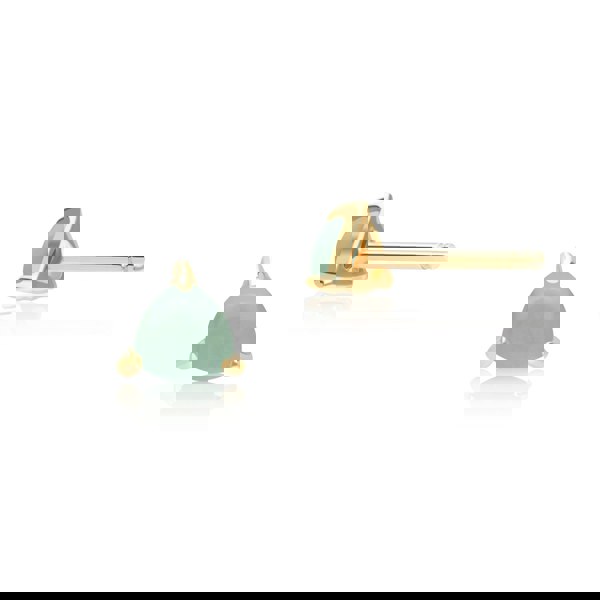 A pair of stunning triangle jade stud earrings crafted in 9ct yellow gold featuring cabochons of dyed green jadeite gemstones in a three claw setting.