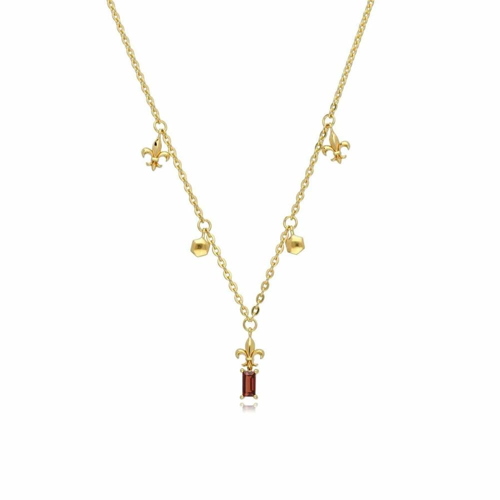This stunning 9ct gold Fleur De Lis choker necklace is inspired by the historical heroine of France and features a beautiful Garnet gemstone. Fleur De Lis is a decorative lily often used to represent Catholic saints of France. The perfect way to add power and elegance to your jewellery collection. This necklace is 38cm in length with a 5. 5cm extender.