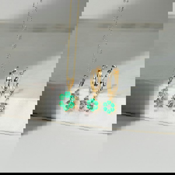 This necklace from the Gemondo Floral collection features a traditional cluster pendant arranged into a flower. A single sparkling diamond sits at the heart of the pendant and is framed by a fringe of emerald petals.