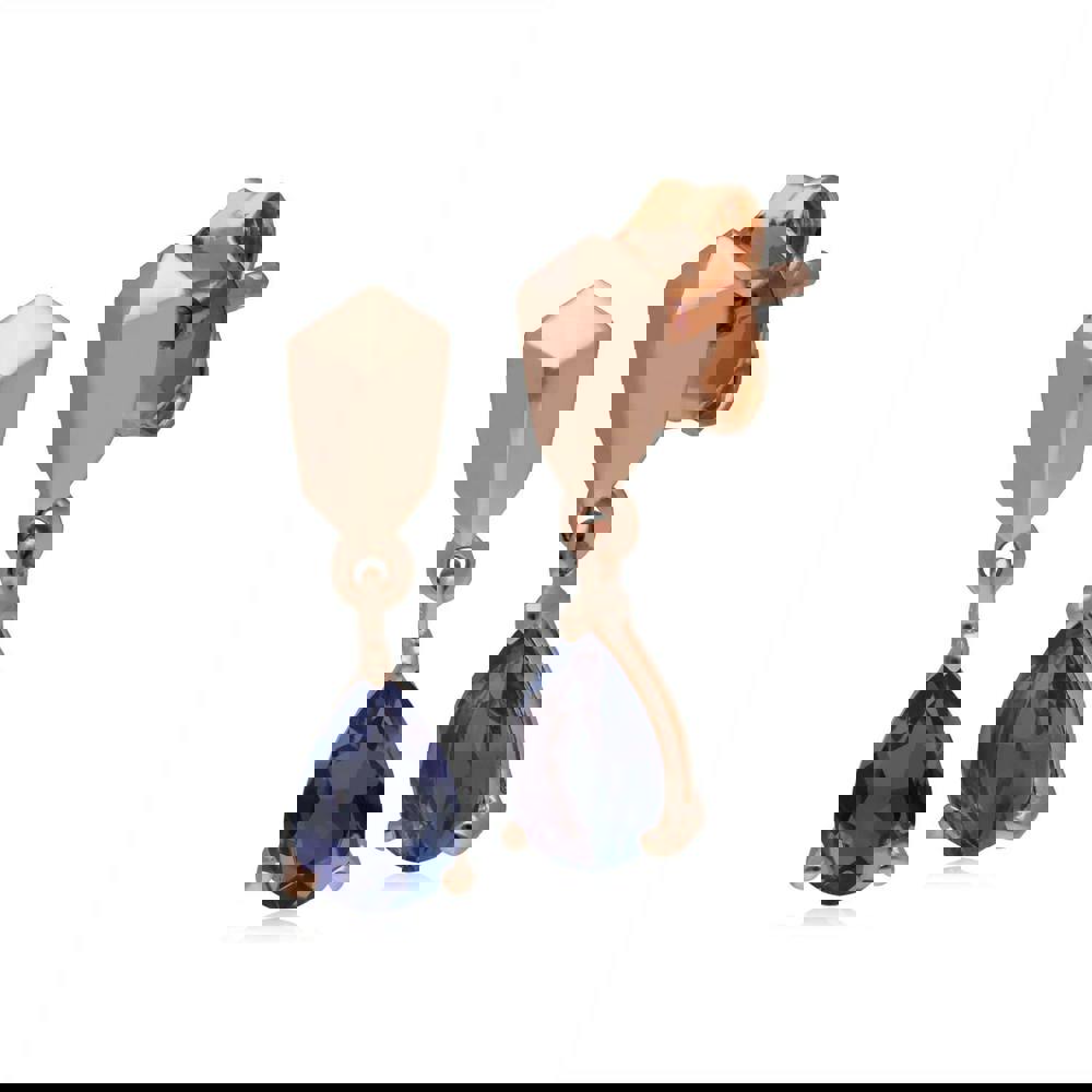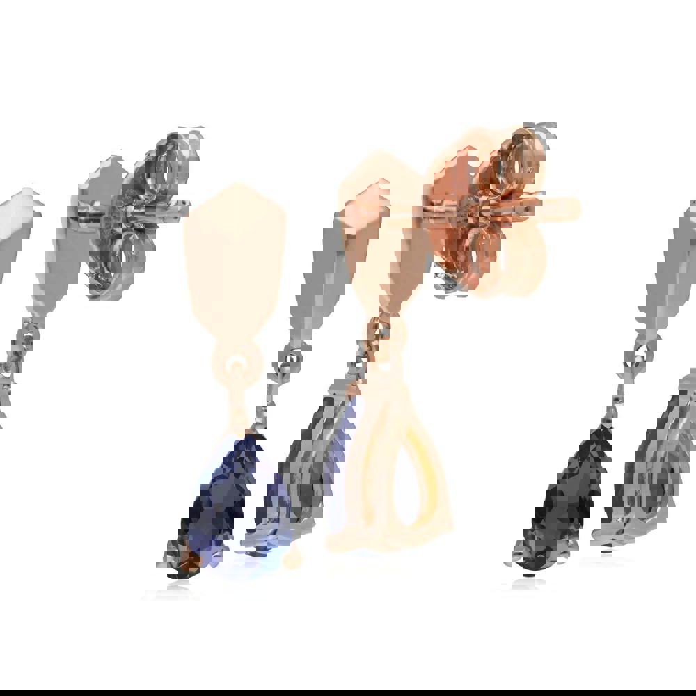 A pair of chic rose gold plated sterling silver drop earrings featuring pear cuts of tanzanite that dangle from a geometric motif. These earrings have a post and butterfly backs and are suitable for pierced ears only.