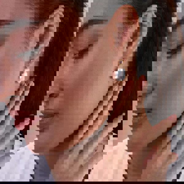 A pair of yellow gold plated sterling silver drop earrings with cultured freshwater baroque pearls that dangle beneath oval moonstone gems in sleek hexagon settings. These earrings have a post and butterfly backs and are suitable for pierced ears only. Due to the nature of baroque pearls each pair will vary in shape and the actual items may differ slightly from this image.