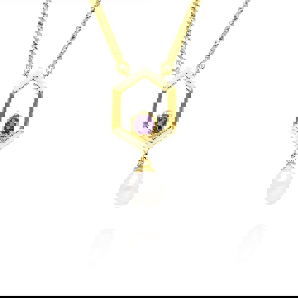 A beautiful sterling silver necklace on a snake chain plated in warm yellow gold, featuring a single hexagon showcasing a purple amethyst gemstone and a dangling cultured freshwater pearl.