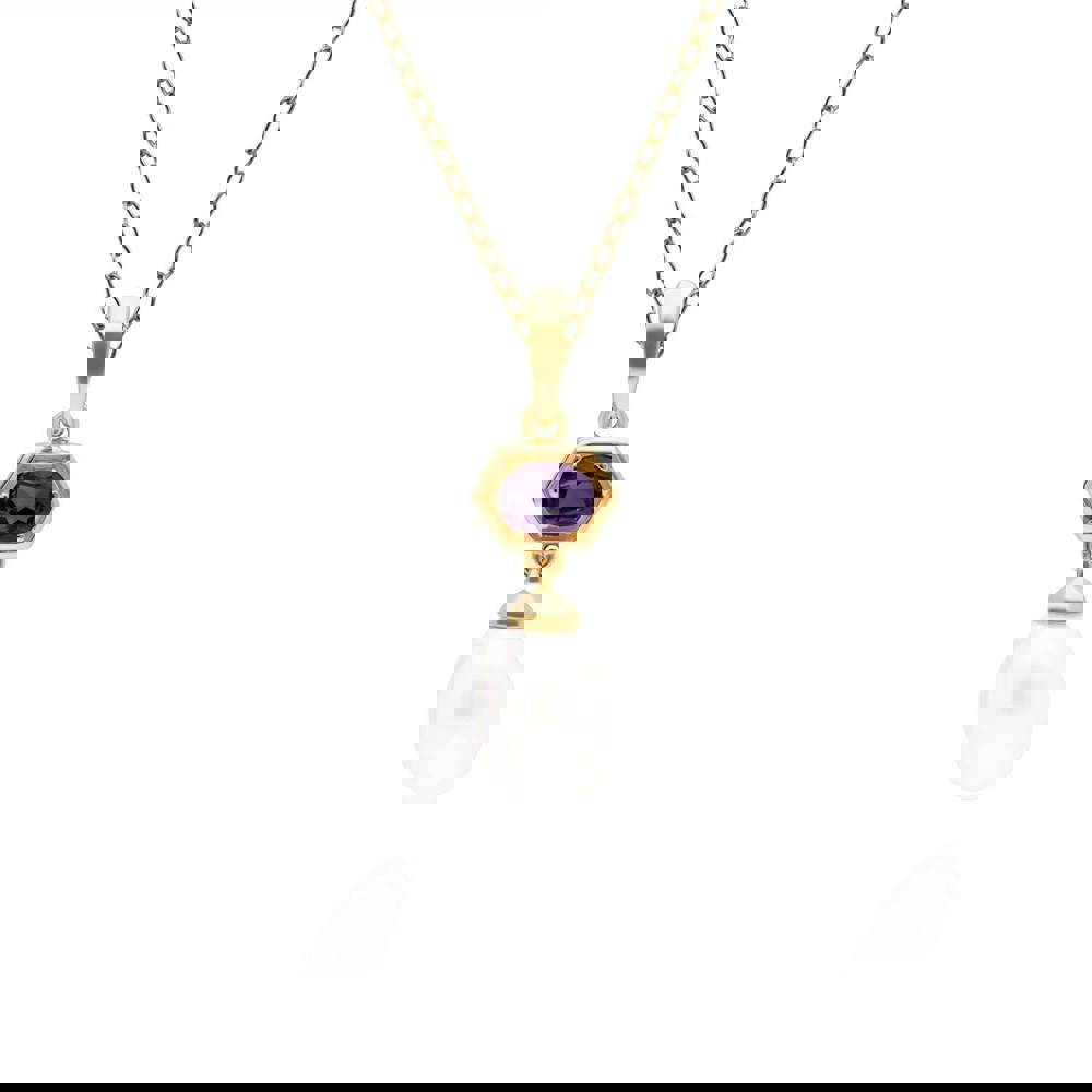 An elegant and contemporary drop pendant featuring a vibrant purple amethyst gem in a hexagon setting with a dangling pearl. This pendant is suspended on a matching yellow gold plated sterling silver chain.