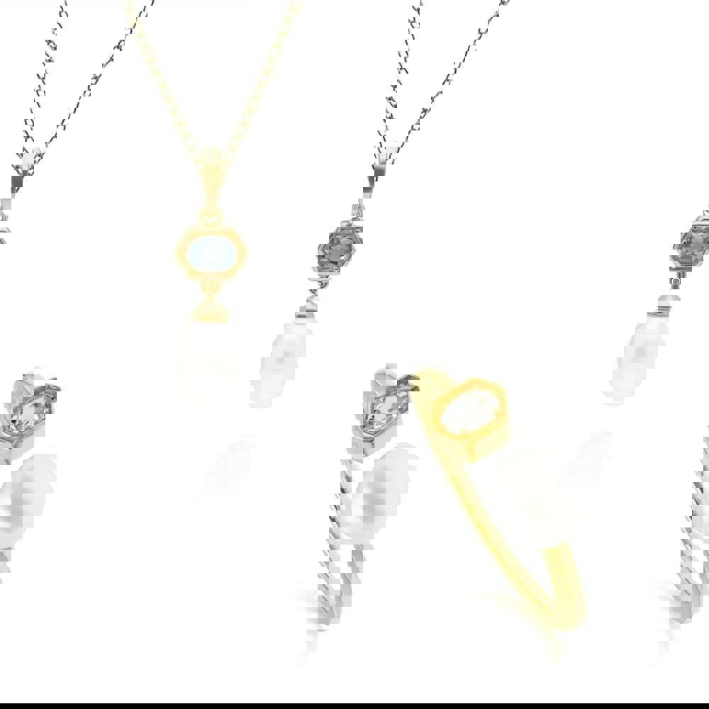A contemporary gold plated sterling silver pendant and open ring set with cultured freshwater pearls and aquamarine gems. This pendant is suspended from a matching gold plated sterling silver chain.