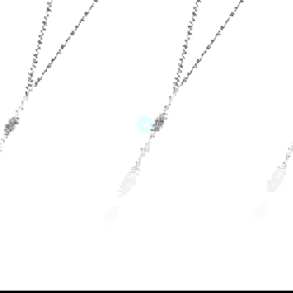 A stylish 925 sterling silver drop pendant featuring a freshwater pearl that dangles beneath a white and blue topaz gemstones in a sleek hexagon setting. This pendant comes with a matching 45cm / 18 inch sterling silver chain.