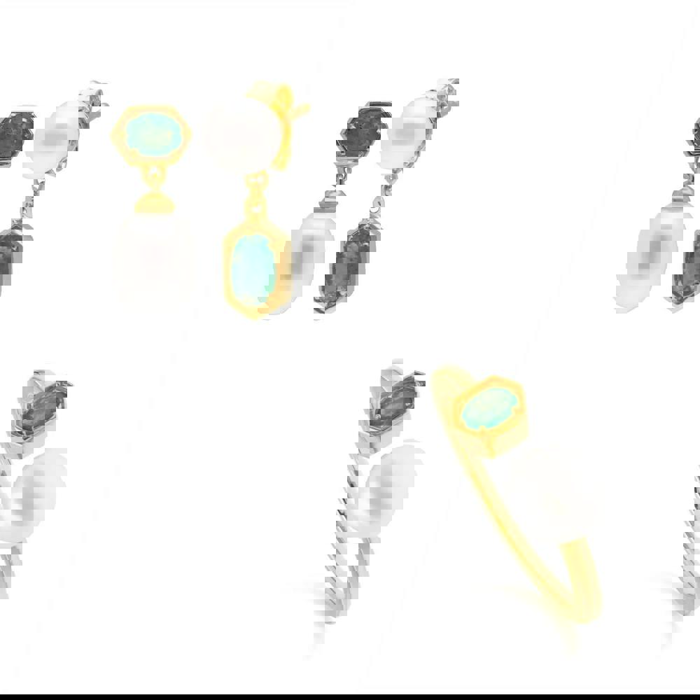 A contemporary gold plated sterling silver mistmatched drop earring and open ring set with cultured freshwater pearls and emerald gems. These earrings have a post and butterfly backs for pierced ears.