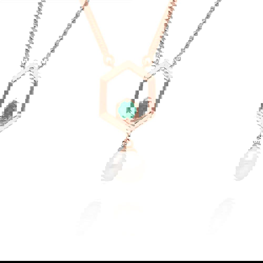 A beautiful sterling silver necklace plated in stunning rose gold, featuring a single hexagon showcasing a central emerald with a dangling pearl.