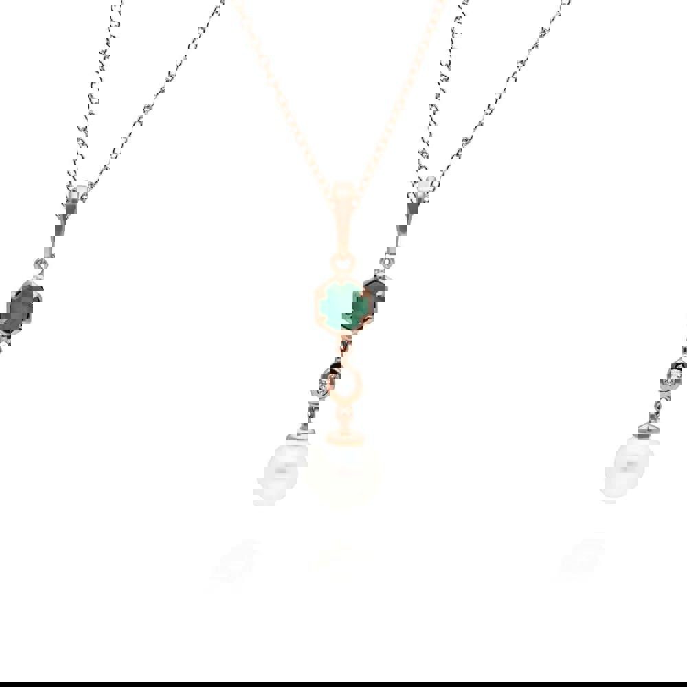 A chic and contemporary drop pendant with a cultured freshwater pearl that dangles beautifully from a geometric setting decorated with a green emerald and white topaz. This pendant is suspended on a matching rose gold plated sterling silver chain.