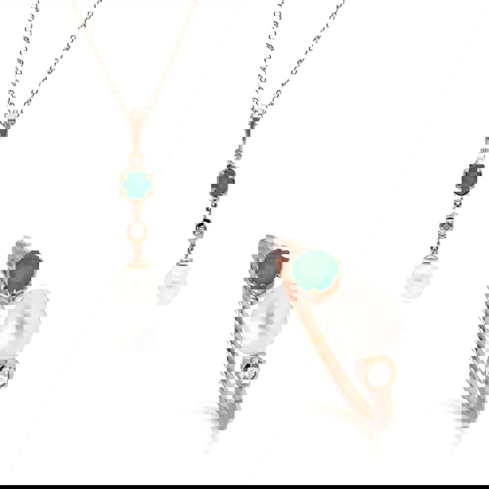 A chic and contemporary drop pendant and ring set with cultured freshwater pearls and geometric settings decorated with green emeralds and white topaz. This pendant is suspended on a matching rose gold plated sterling silver chain.