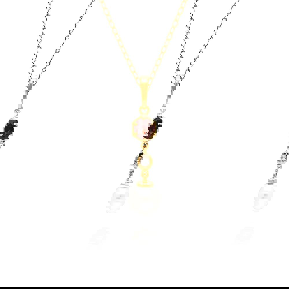 A chic and contemporary drop pendant with a cultured freshwater pearl that dangles beautifully from a geometric setting decorated with a red garnet and white topaz. This pendant is suspended on a matching yellow gold plated sterling silver chain.